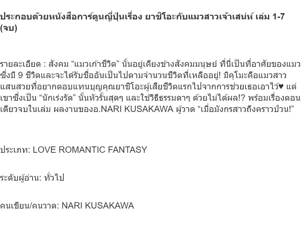 ชื่อหนังสือการ์ตูนญี่ปุ่นเรื่อง ยาชิโอะกับแมวสาวเจ้าเสน่ห์ เล่ม 1-7 (จบ) ประเภท การ์ตูน ญี่ปุ่น บงกช bongkoch