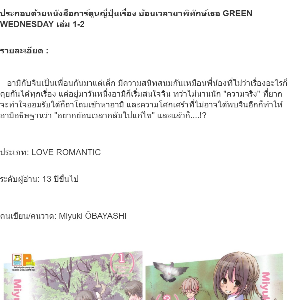ชื่อหนังสือการ์ตูนญี่ปุ่นเรื่อง ย้อนเวลามาพิทักษ์เธอ GREEN WEDNESDAY เล่ม 1-2 (จบ) ประเภท การ์ตูน ญี่ปุ่น บงกช Bongkoch