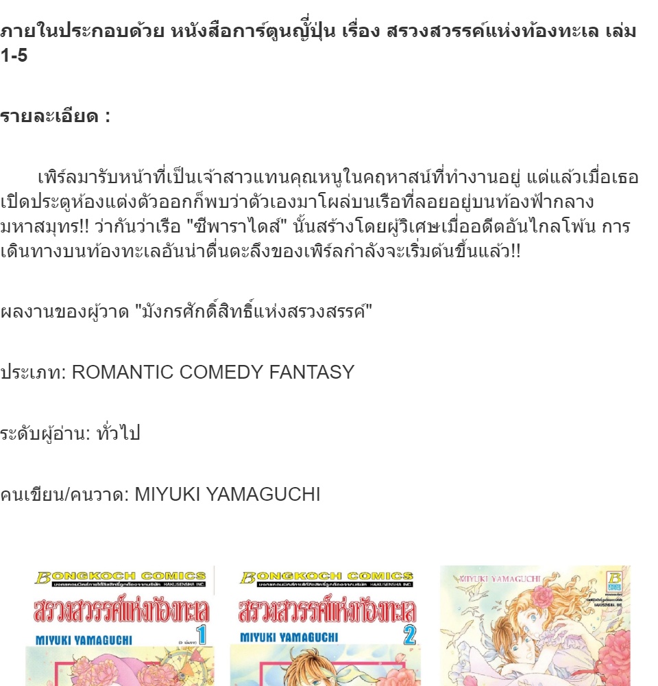 ชื่อหนังสือการ์ตูนญี่ปุ่น เรื่อง สรวงสวรรค์แห่งท้องทะเล เล่ม 1-5 (จบ) ประเภท การ์ตูน ญี่ปุ่น บงกช Bongkoch