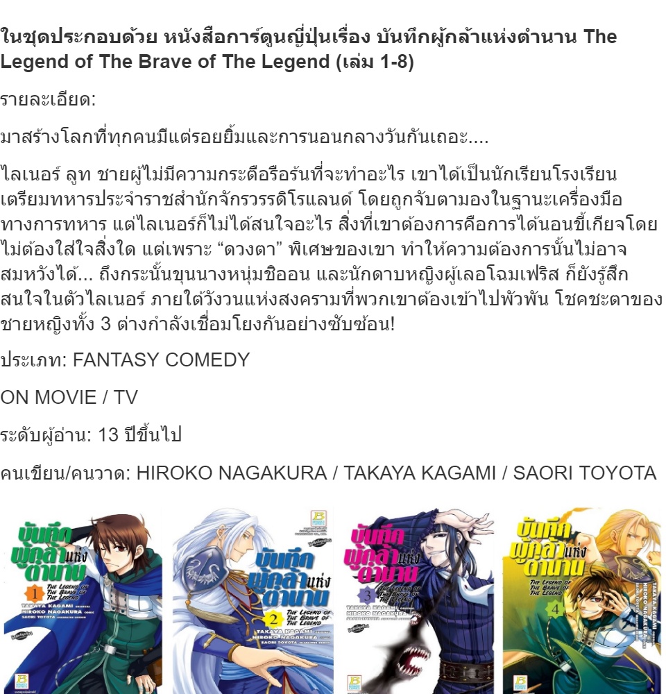 ชื่อหนังสือ บันทึกผู้กล้าแห่งตำนาน The Legend of The Brave of The Legend (เล่ม 1-8)*มีเล่มต่อ ประเภท การ์ตูน ญี่ปุ่น บงกช Bongkoch *ราคานี้ รวมค่าจัดส่งแล้ว*